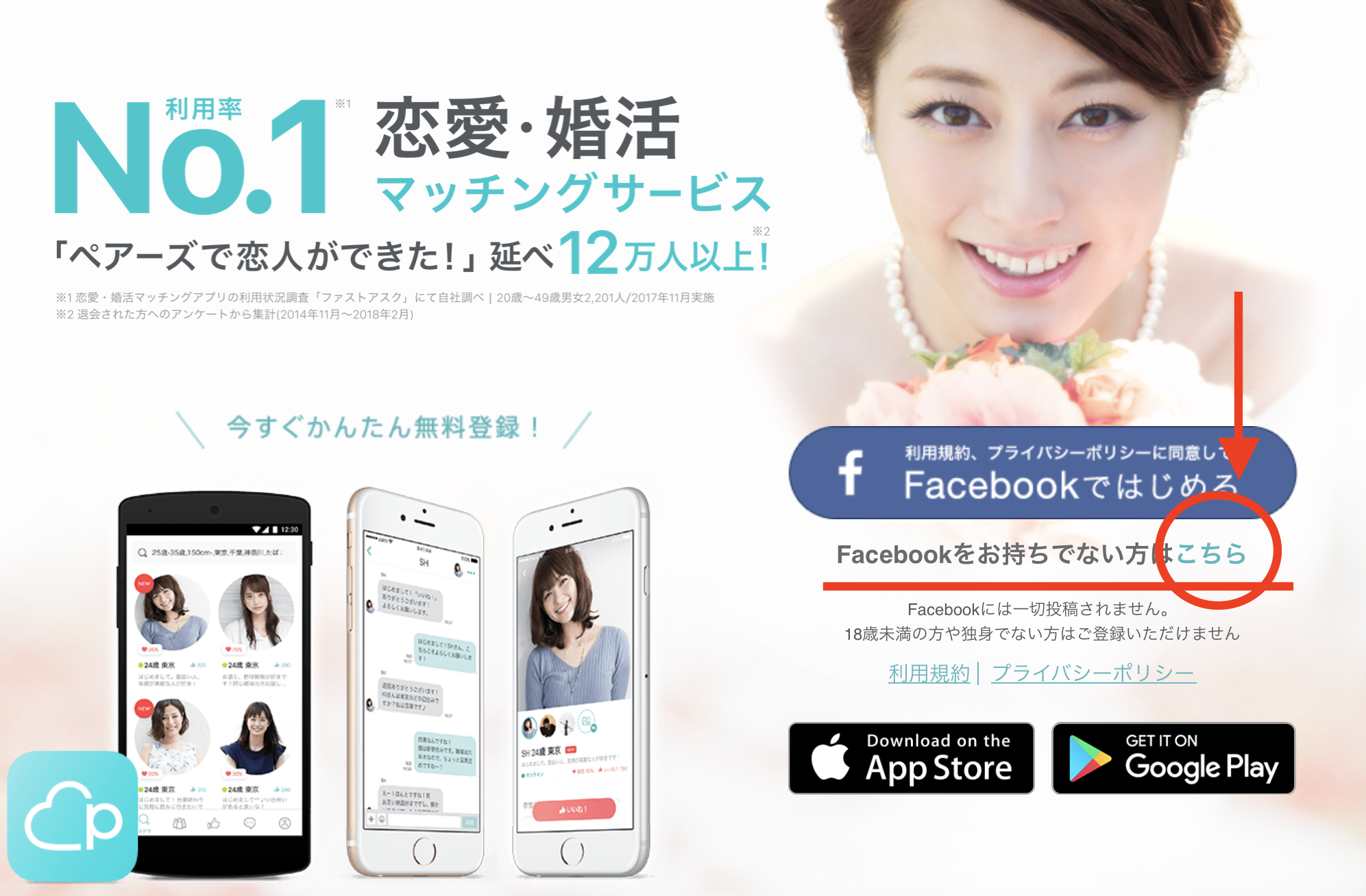 まずはペアーズのトップページの「Facebookをお持ちでない方はこちら」をクリック。
