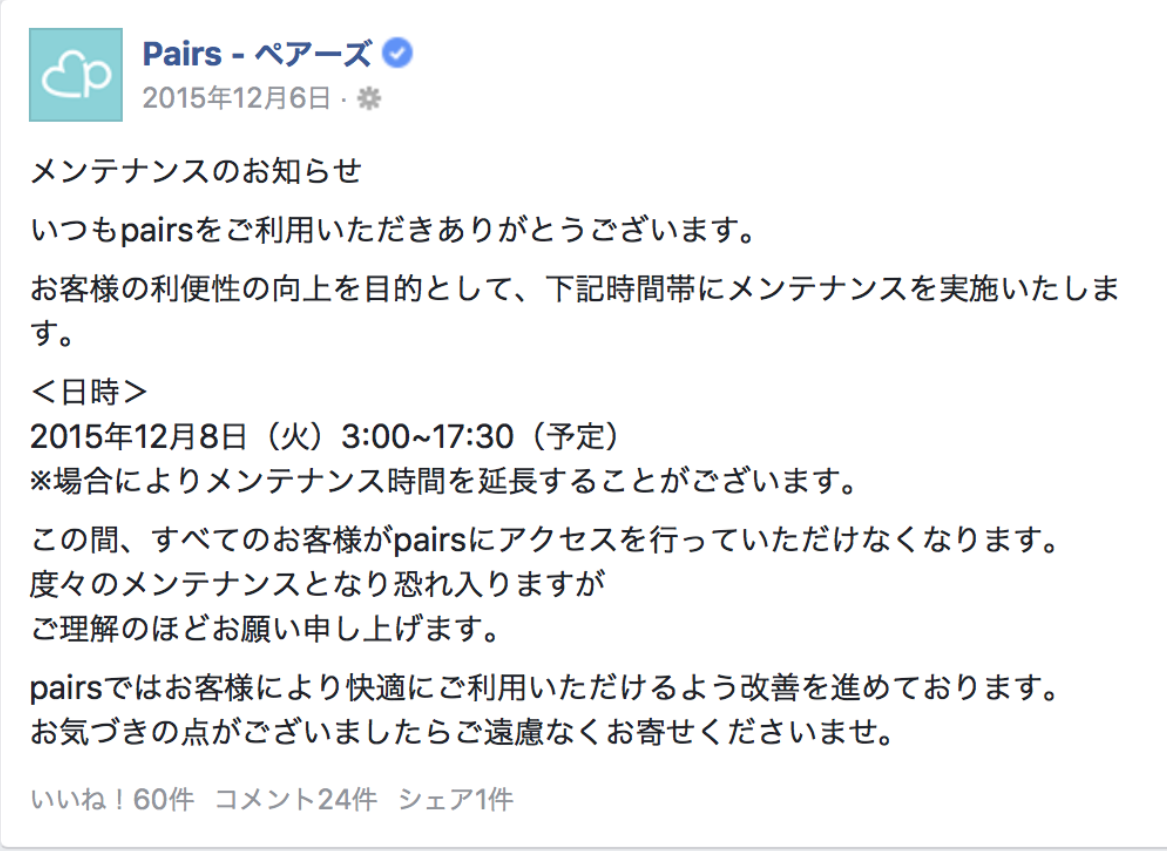 稀に、ペアーズ側のメンテナンス等でログインできないパターンもあります。