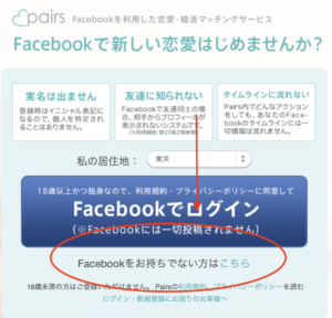 PCブラウザからペアーズのHPを開き、「facebookをお持ちでない方はこちら」