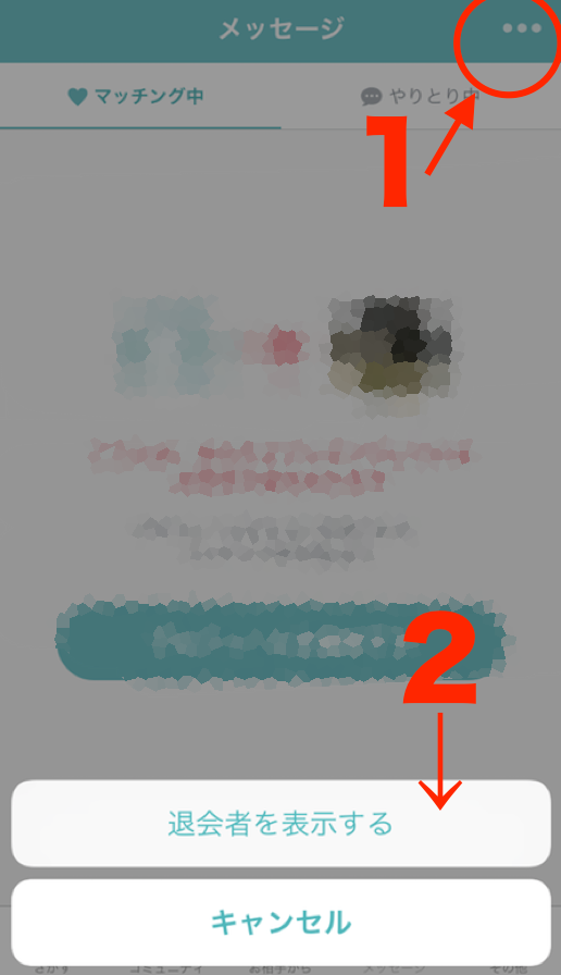 まず、メッセージページを開きます。そして、メッセージページの右上「・・・」をクリックし、「退会者を表示する」で退会したユーザーを見ることができます。